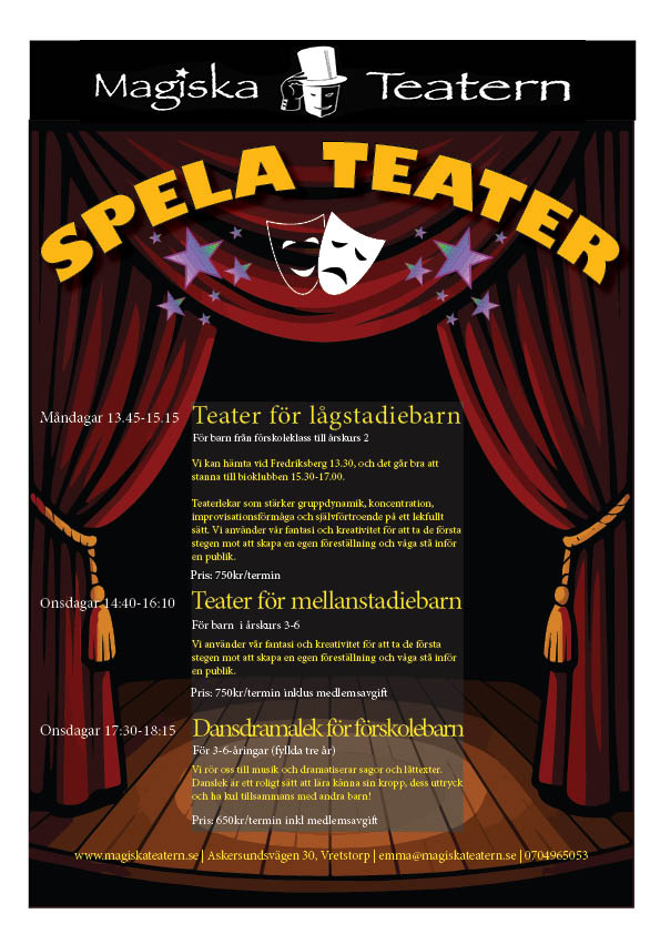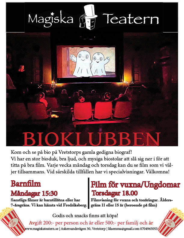 Hej och välkommen till Magiska Teaterns hemsida! Här kan du hitta information om oss och vår verksamhet. Kika runt och se om du hittar något du gillar. Eller ta en tur till Vretstorp och upplev miljön i vår gamla fd biograf där magin sitter i väggarna!